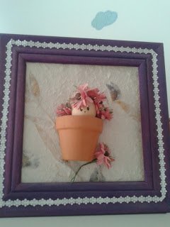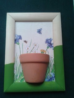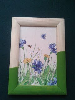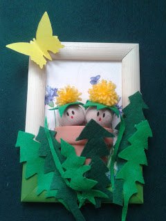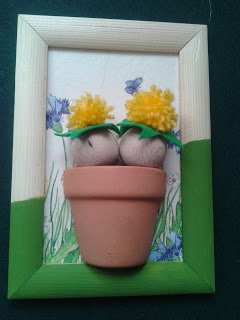 Most a bogáncsvirágot választottam, egyből kettőt. Hogy miért ezt? Megtetszett a sárga pamut fonal, olyan élénk színe van! Találtam a gyűjteményemben egy olyan szalvétát is, amin van pl.: bogáncs virág is, így TV nézés helyett este neki is estem. Először a képkeret lapjára ragasztottam a szalvétát dekupázs ragasztóval. Aztán lefestettem a keretet félig olivazöldre. A pompom elkészítéséhez ezt a módszert választottam: