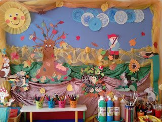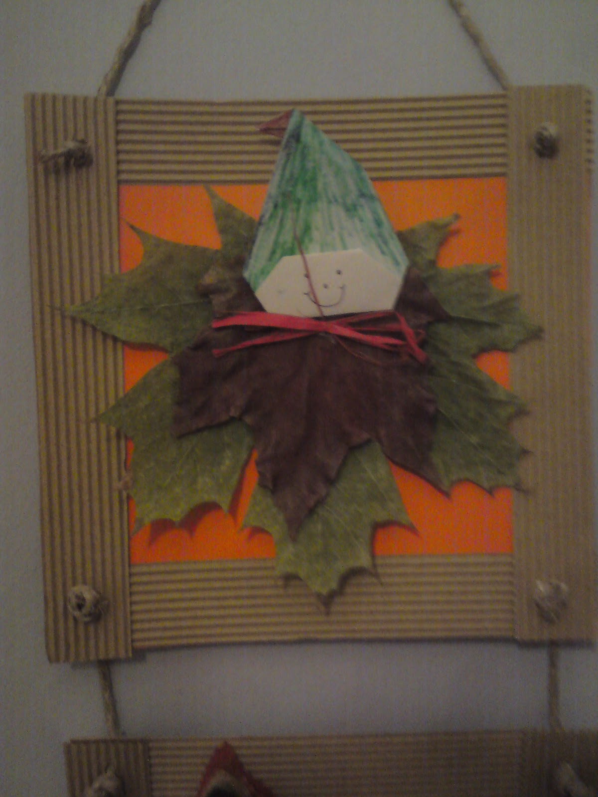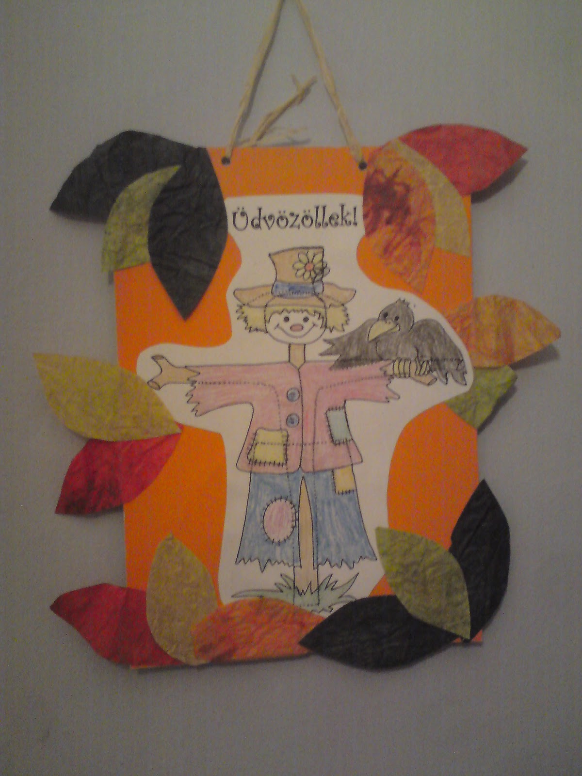 Ez csak egy színező figura volt, amit egy narancssárga kartonra ragasztottunk, köré pedig csomagolópapírból kivágott faleveleket tettünk. Imádták a gyerekek, mert a kicsik is részt tudtak venni a munkában!