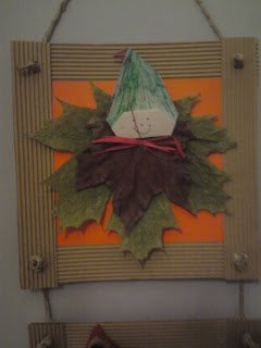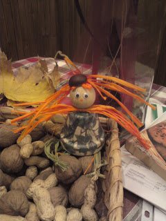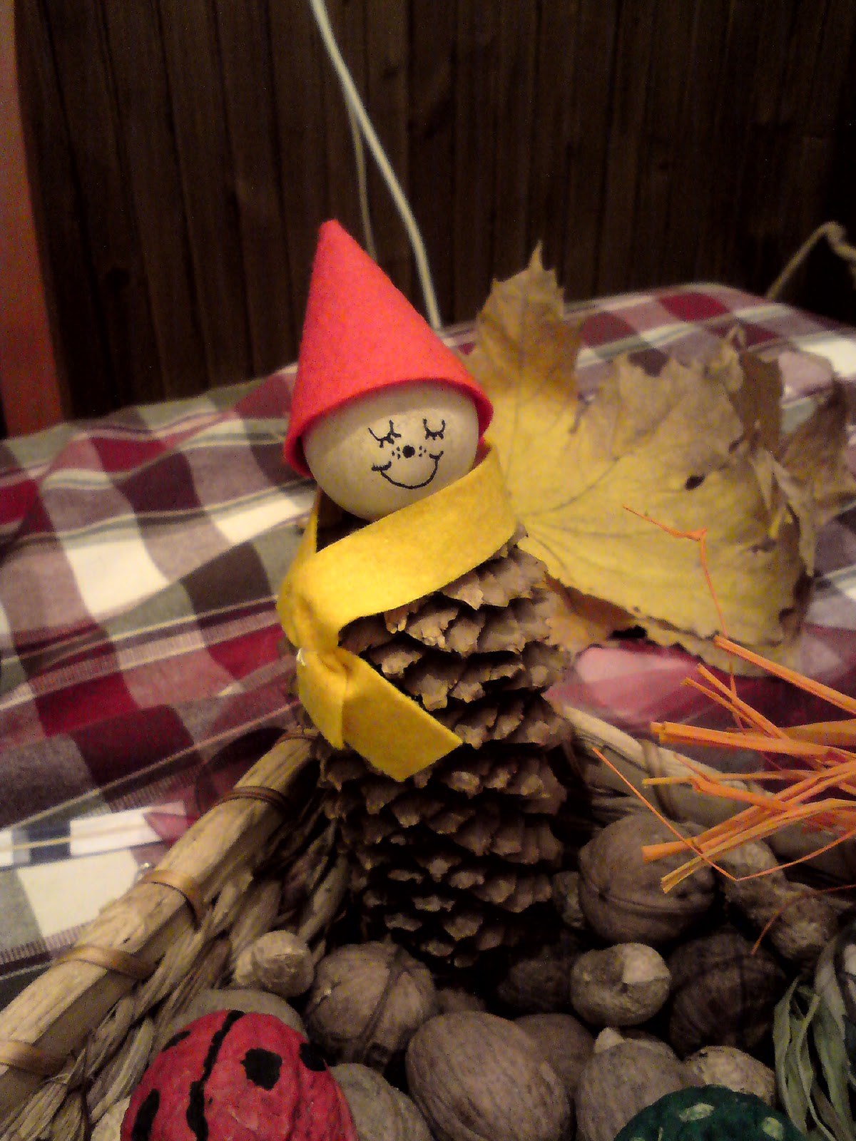 Ez a kis manó egy foglalkozásra készült és a lányom szobájában landolt! A kerámiacserepet lekentem akrill festékkel, majd egy borostyánleveles szalvétát rádekupázsoltam. A fejét színes raffiával kötöztem hozzá, majd kapott egy gesztenye tökfödőt.