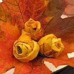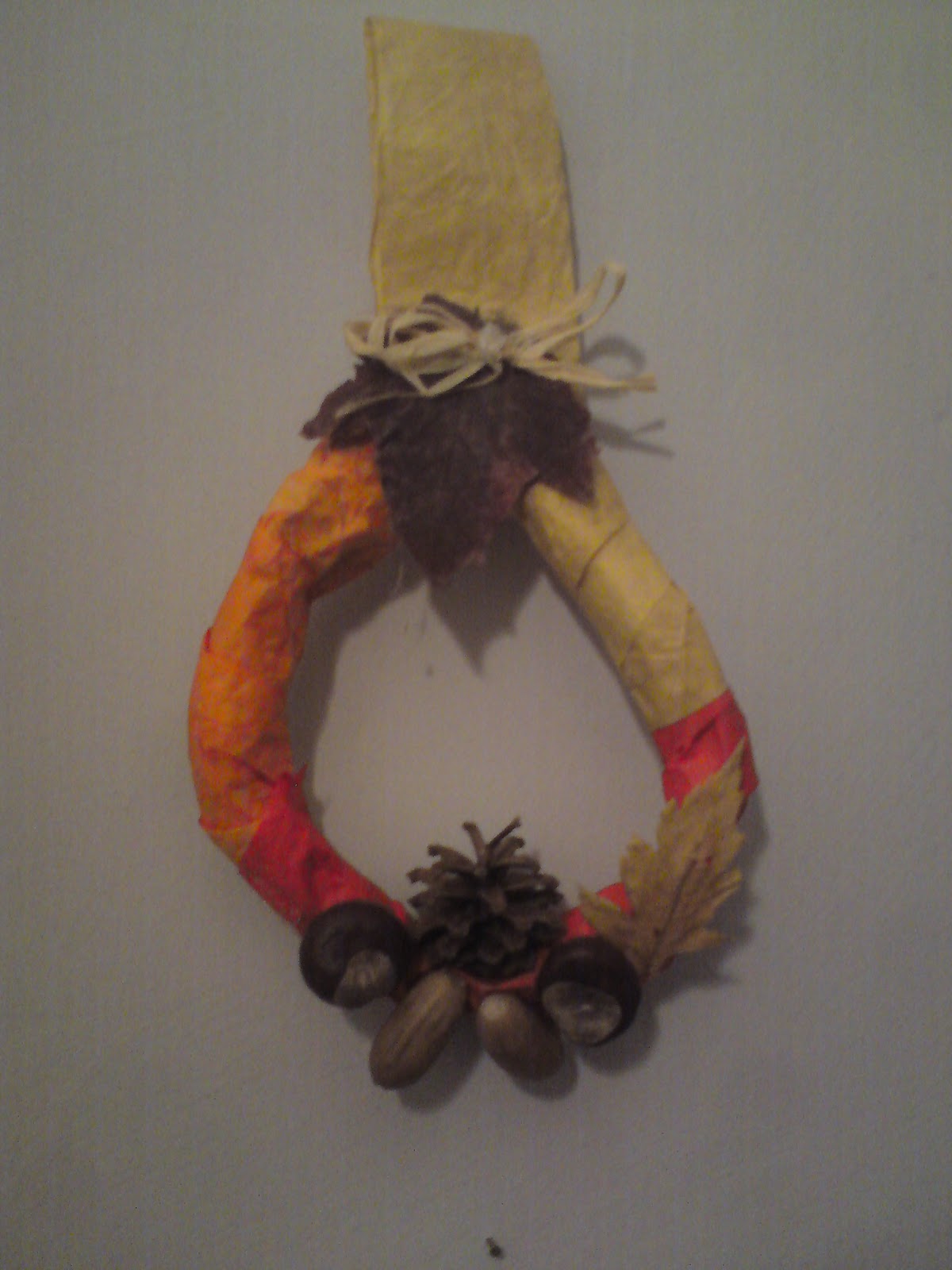 Nagy sikere volt tavaly ennek a koszorúnak, ami szintén hulladékokból készült. Egy nagyobb újságpapírt (pl.: Média Markt-os újság) fel kell tekerni, majd egy kicsit megcsavarni (de nem muszáj) és a két végét összefogni, összergasztani. Ez így lehet kör-, csepp-, szív forma is, a fantáziánkon múlik. A borítása lehet krepp-papír csík, vagy csomagoló papír, amit egyszerűen csak rá kell csavarni, picit odaragasztani. A terméseket ragasztópisztollyal ragasztottam oda, így tartósabb. Nagyon egyszerű elkészíteni és nagy sikere volt kicsiknél és a nagyobbaknál is, amit aztán lehet szintén tovább vinni az évszakokra.