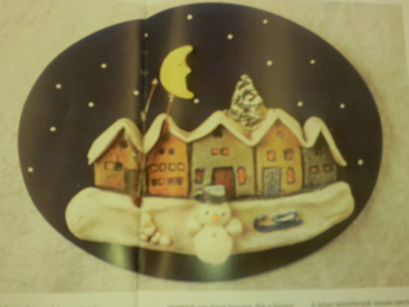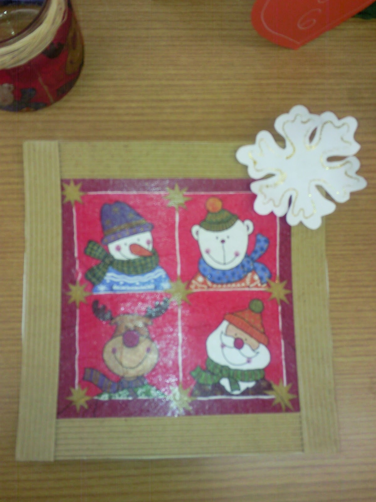 Ez a kép decupage technikával készült. Kivágtam egy fehér kartonból egy darabot. Bekentem decupage ragasztóval az adott felületet, majd a szalvétát a ragasztóval “ráfestettem”. Mielőtt ráteszed a szalvétát, szedd szét (általában 3 részből áll), mert ha nem teszed, nem fog sikerülni. A “festésnél” a levegő buborékokat kell kifelé terelgetni, de csak óvatosan, nehogy kilyukadjon a szalvéta. Aztán ha elkészült, jöhet rá a keret, ami hullámkartonból készült. A szélére egy papír hópelyhet tettem, amit csillámos ragasztóval díszítettem.