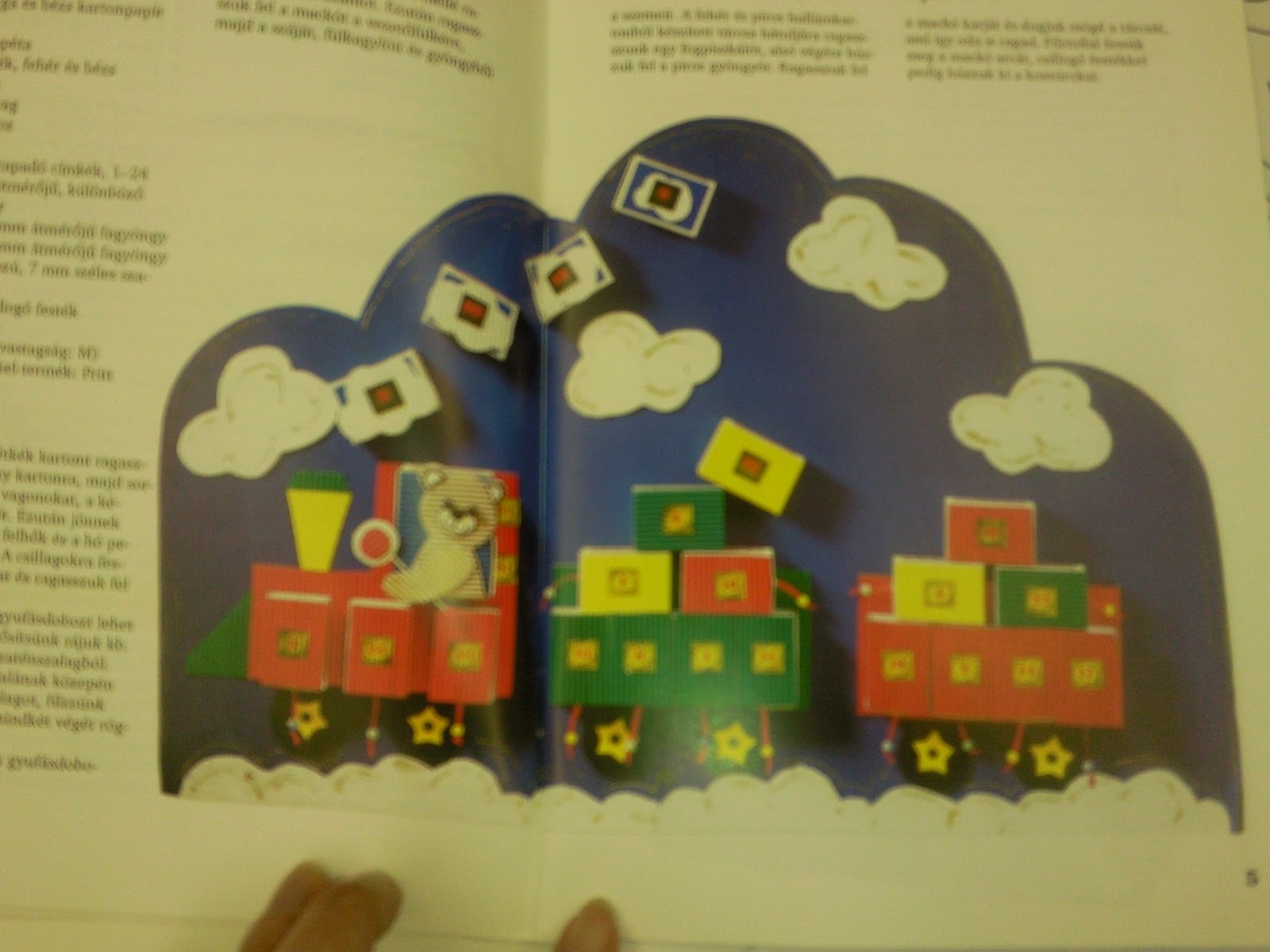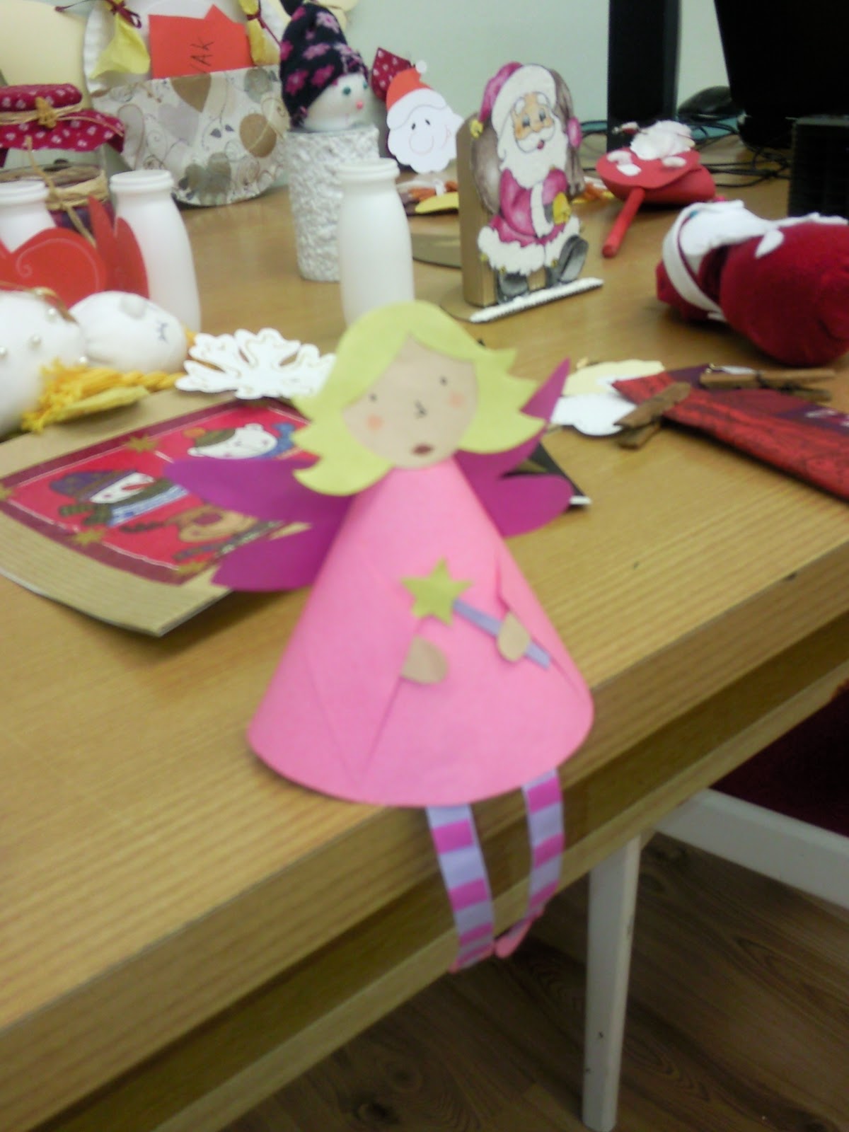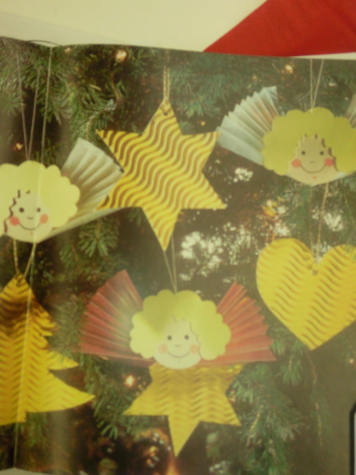 Imádom ezt a kis angyalkát, amit minden évben elkészítek. Szintén a fenn említett könyből van az ötlet. A fejét fehér műszaki kartonból (egy egyszerű kör), a haját dekor kartonból készítem. A szárnya harmónika szerűen lett hajtogatva. Nagyon könnyű megcsinálni és mégis nagyon mutatós kis ötlet.