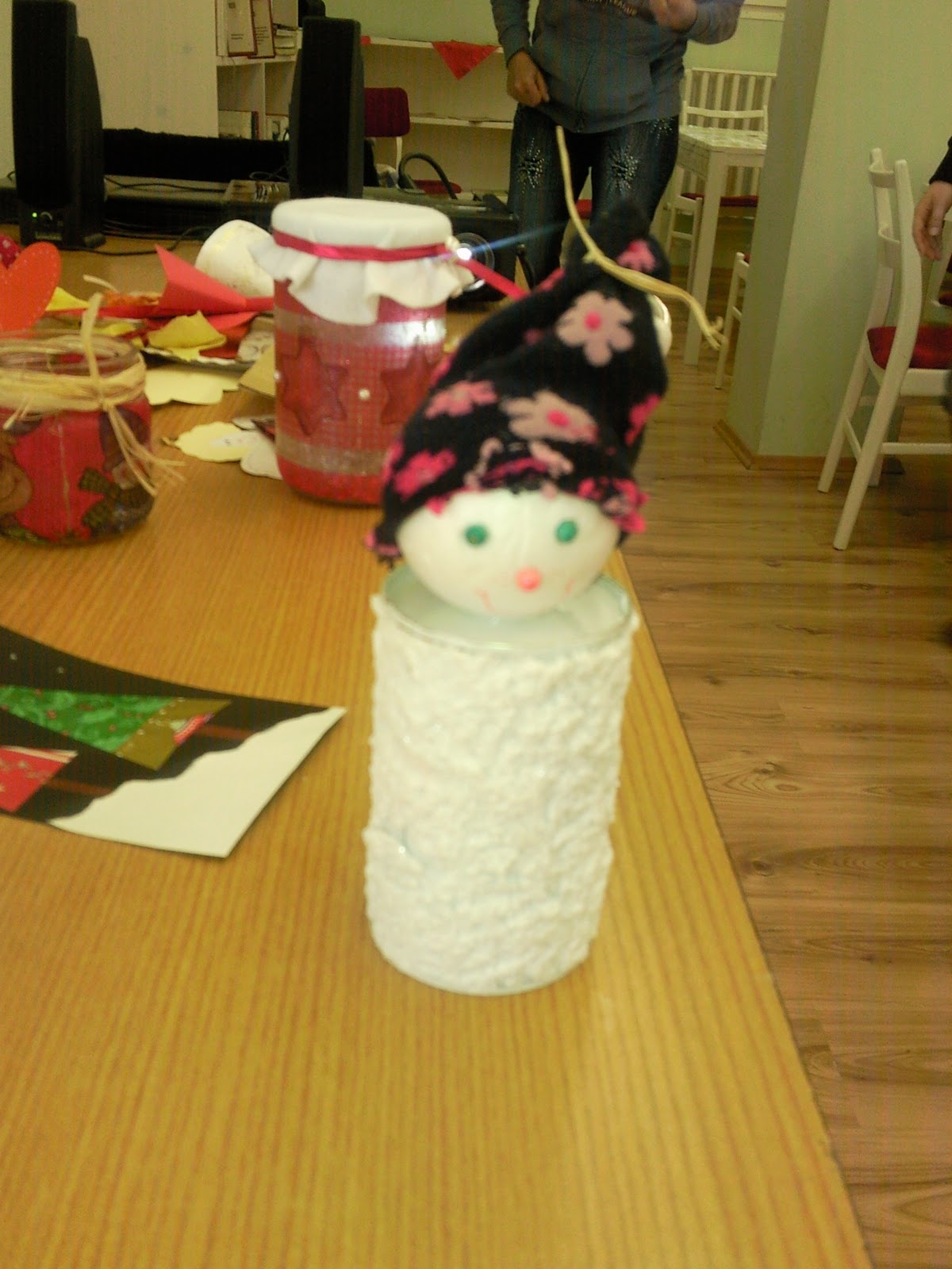 Egy régi festékes fémdobozt kentem be csillámos hópasztával. A manó feje hungarocel gömb, amire egy zoknidarabot húztam. A szeme és az orra gyöngy. Amikor minden meglett, ragasztópisztollyal rögzítettem. A manó feje mögé vágni kell egy nyílást, ahol befér a pénz (de figyelni kell, nehogy megvágja a gyermekek kezét), az alja pedig kinyitható legyen. Sajnos ez is egy befejezetlen “műalkotás”, hiszen se keze, se lába, de az alap ötletet ti már biztosan tovább tudjátok gondolni.