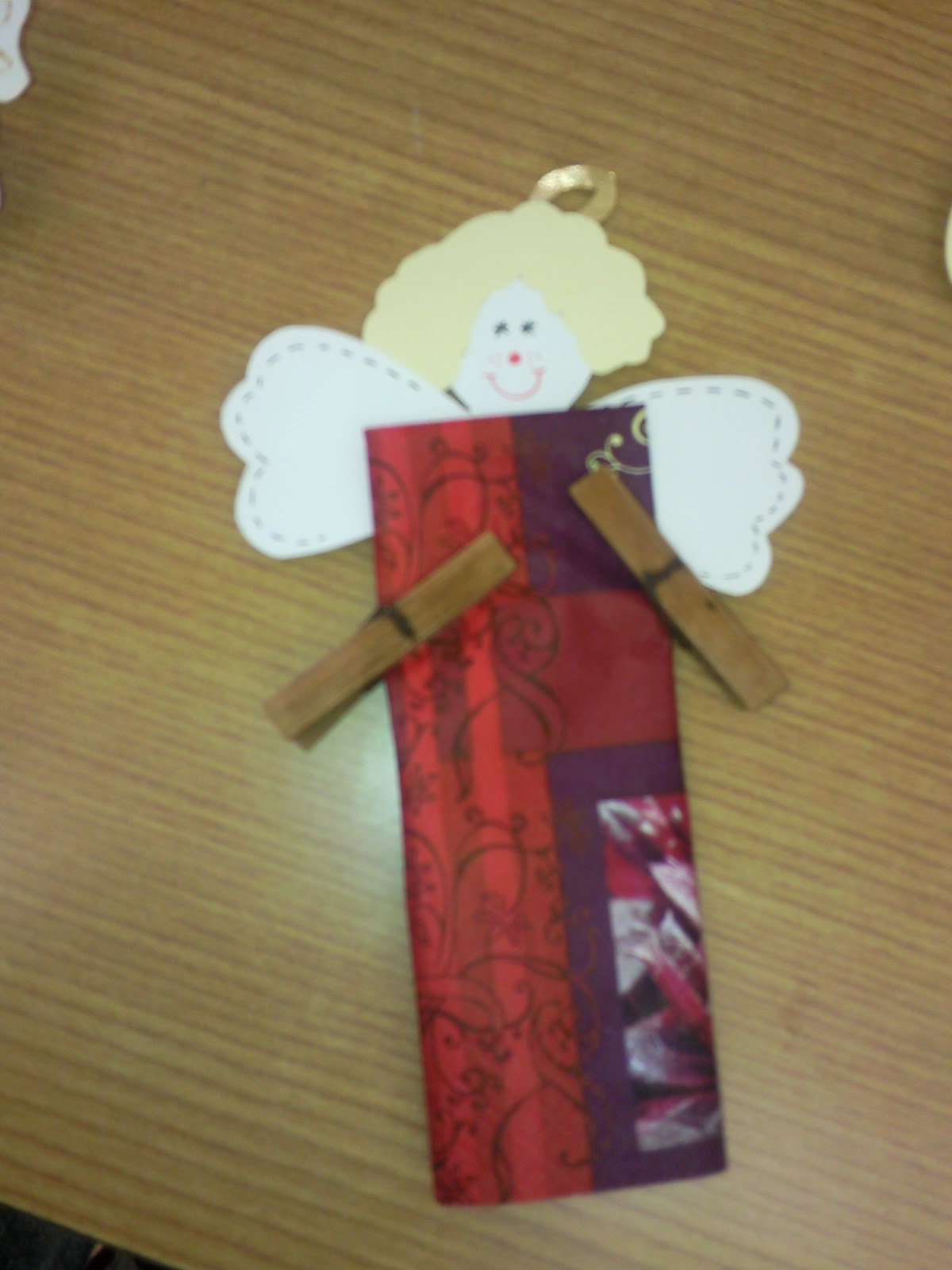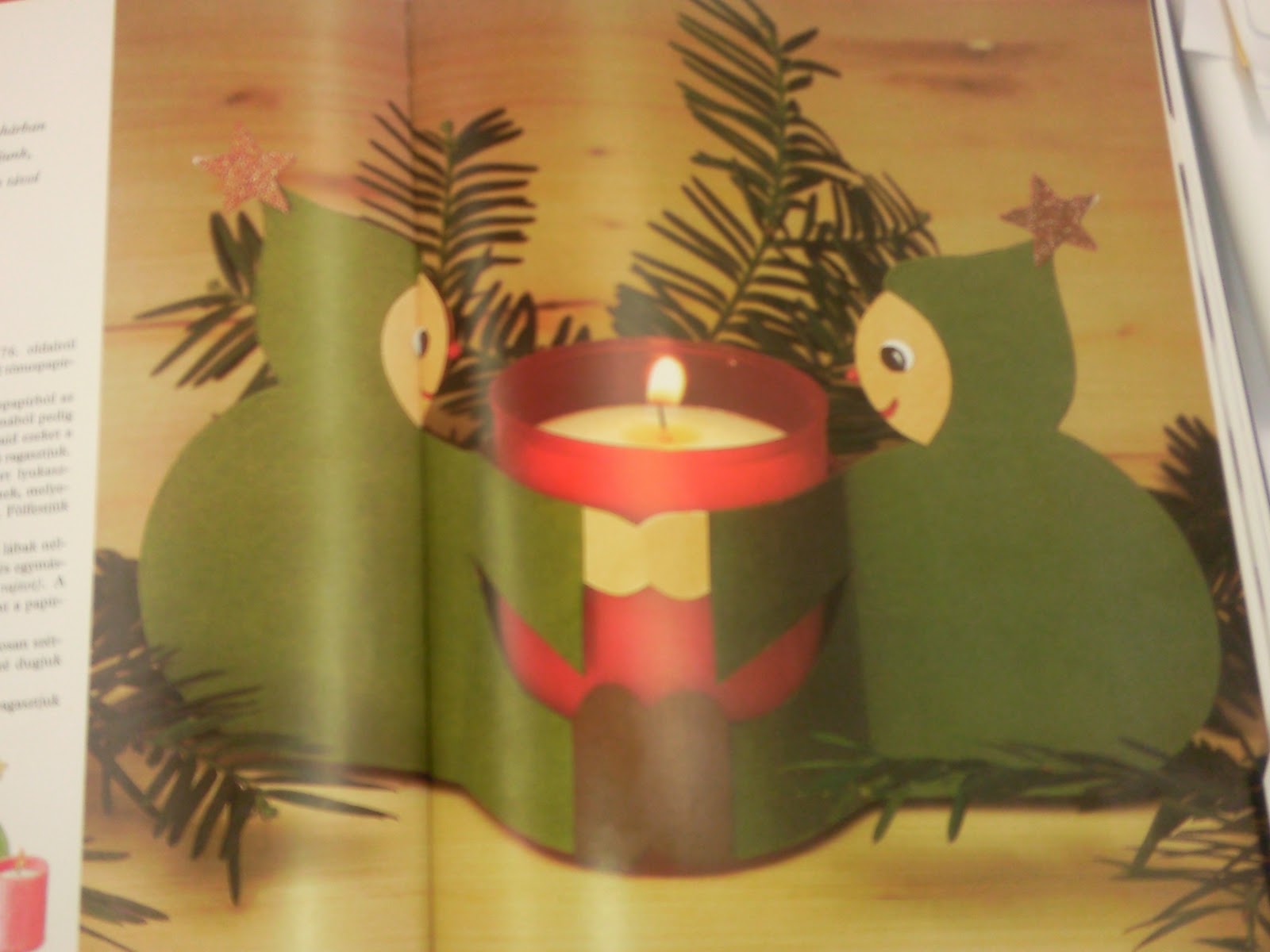 Ezt a szintén egyszerű ötletet egy újságban láttam, amit hamarosan felteszek a blogra, mert nagyon jó ötletek vannak benne! Csak az anygalka fejét és szárnyát kell papírból kivágnod, hiszen a teste a karácsonyi szalvéta. Ezeket facsipesszel rögzítheted és már kész is a kedves karácsonyi asztaldísz.