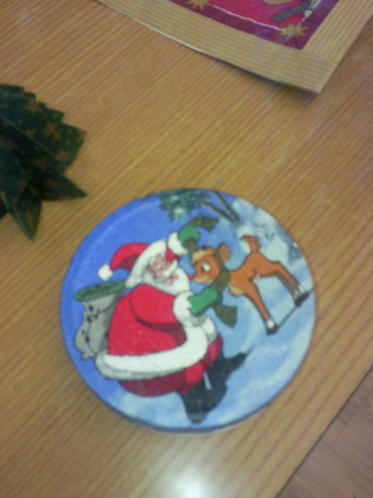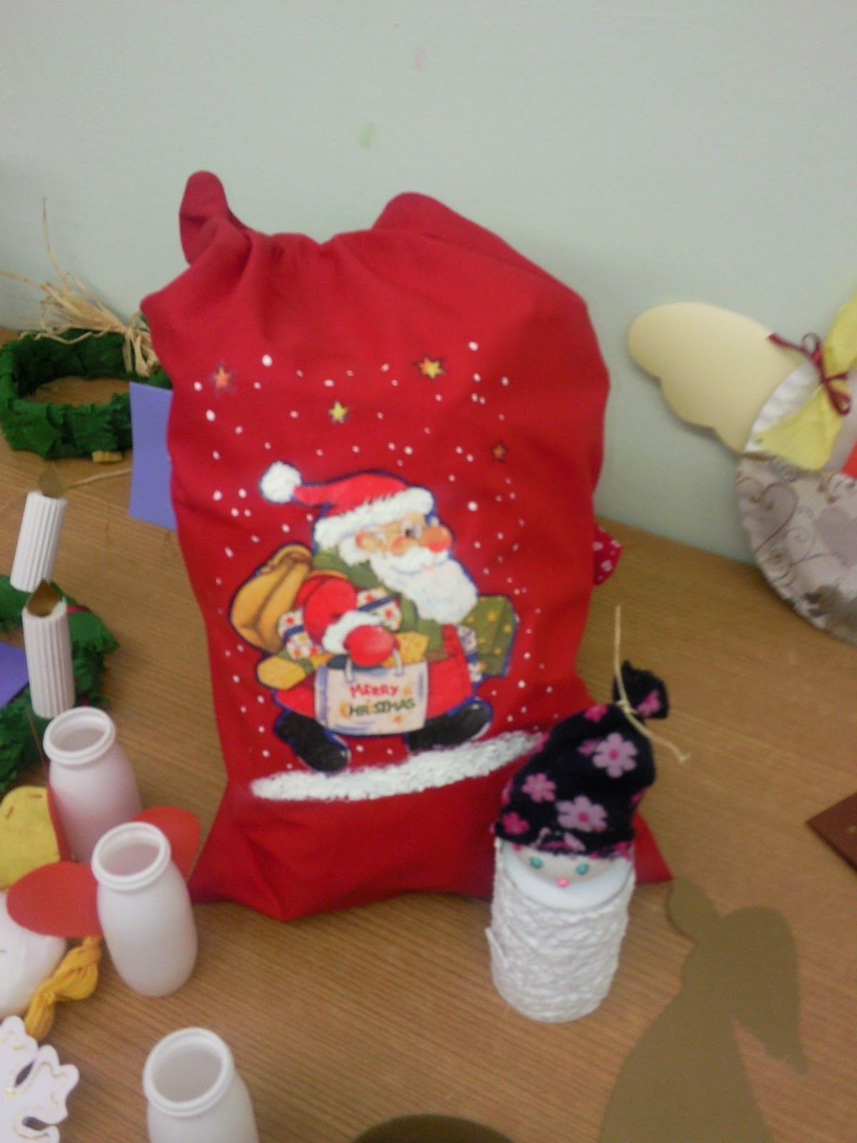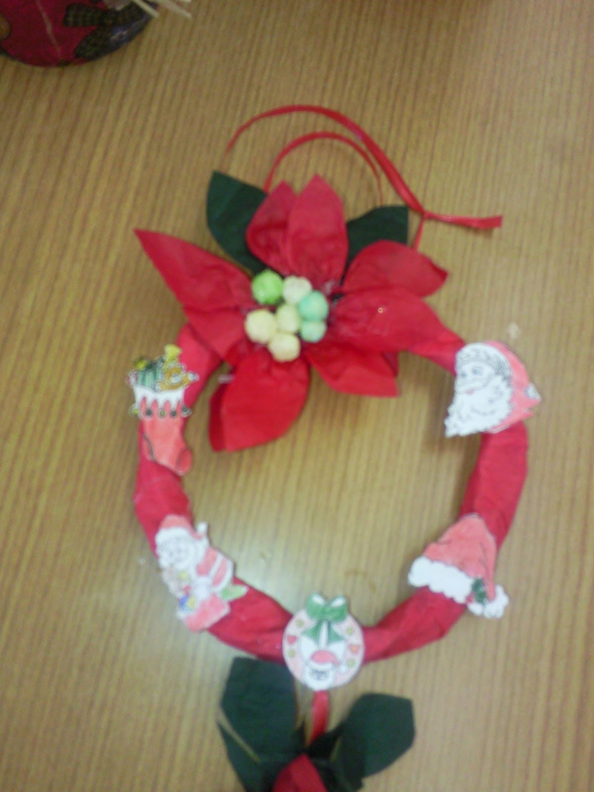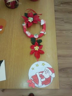 Ezt a díszt a könyvtáros kolléganő, Katika készítette. A koszorú alapja újságpapír, amit feltekert és piros krepp-papírral bevonta. Ezt csomagoló papírból készült mikulás-virággal és nyomtatott színezőkkel díszített. A bogyók színes cukorkák, ami szintén nagyon jó ötlet. Szerintem ezt iskolában és játszóházban is elkészíthetitek, mert nem nehéz és olcsó ötlet, de mégis jól néz ki.