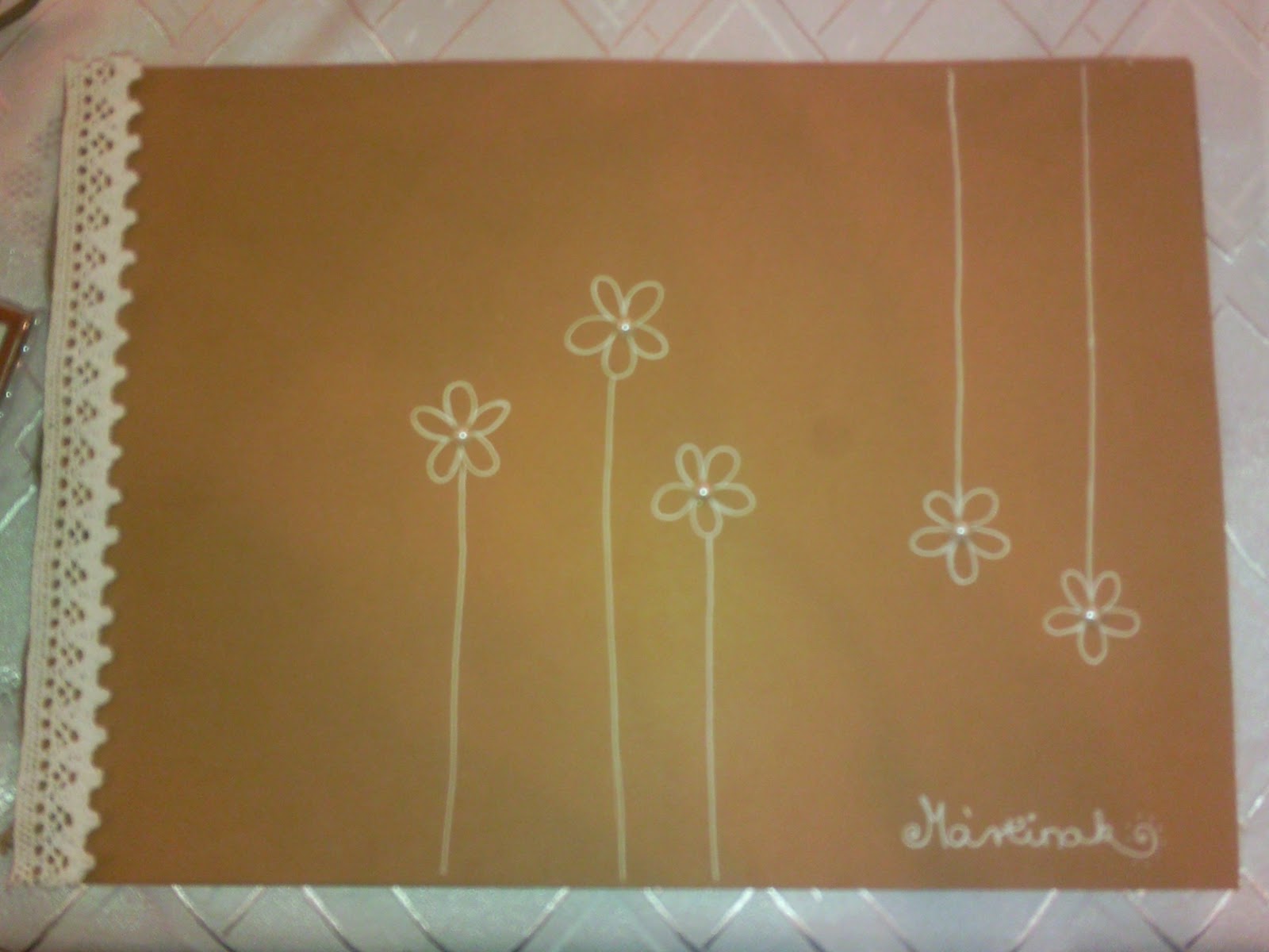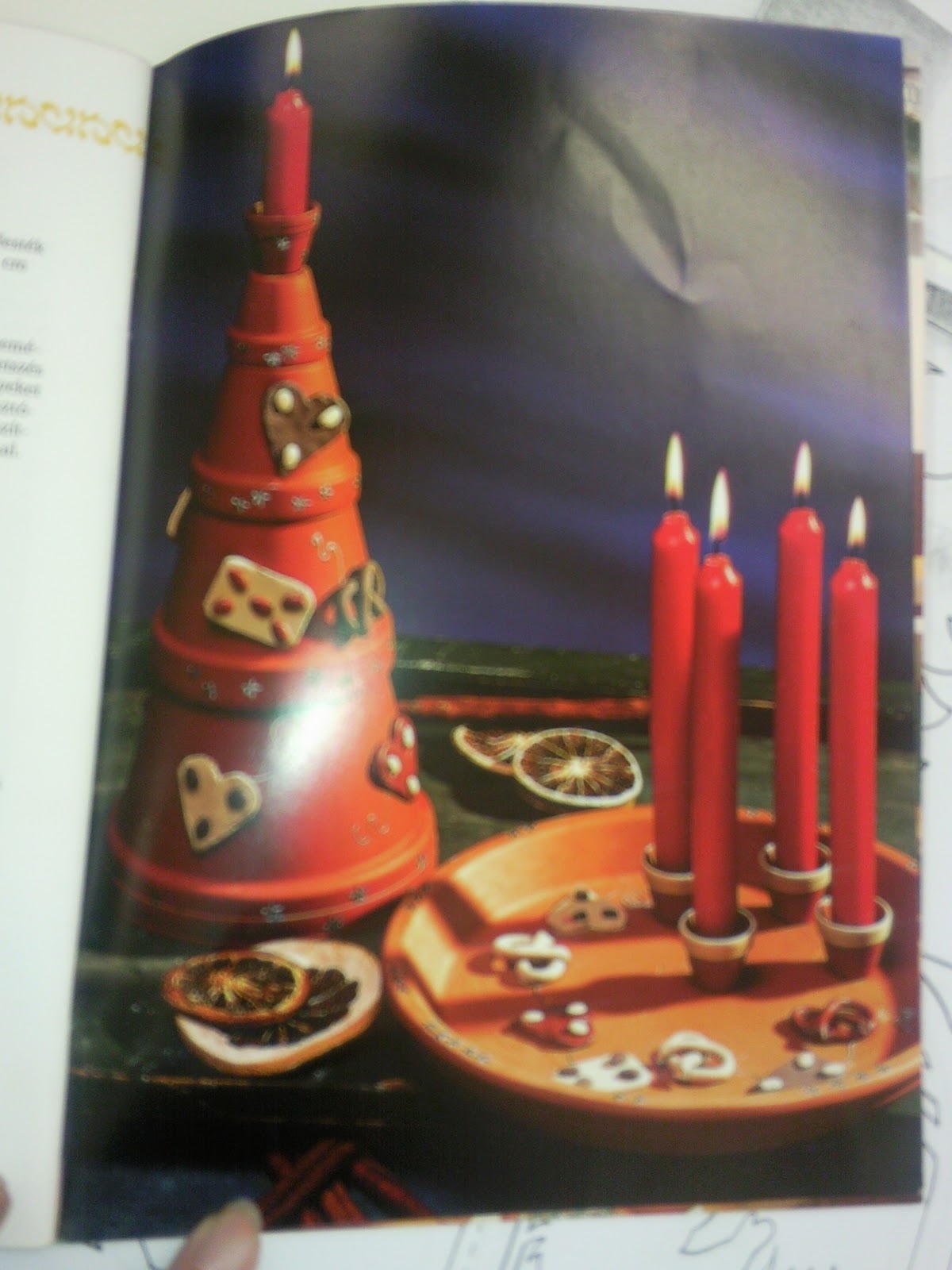 Nagyon tetszett ez az ötlet is, ezért felraktam ide. A cserepet akrill festékkel és arany kontúr festékkel díszítette a készítője (könyv cím lejebb), majd hőre keményedő gyurmát használt, amit ragasztópisztollyal rögzített. A tetején a gyertyák úszú gyertyák, ami még különlegesebbé tette azt a szép asztaldíszt.