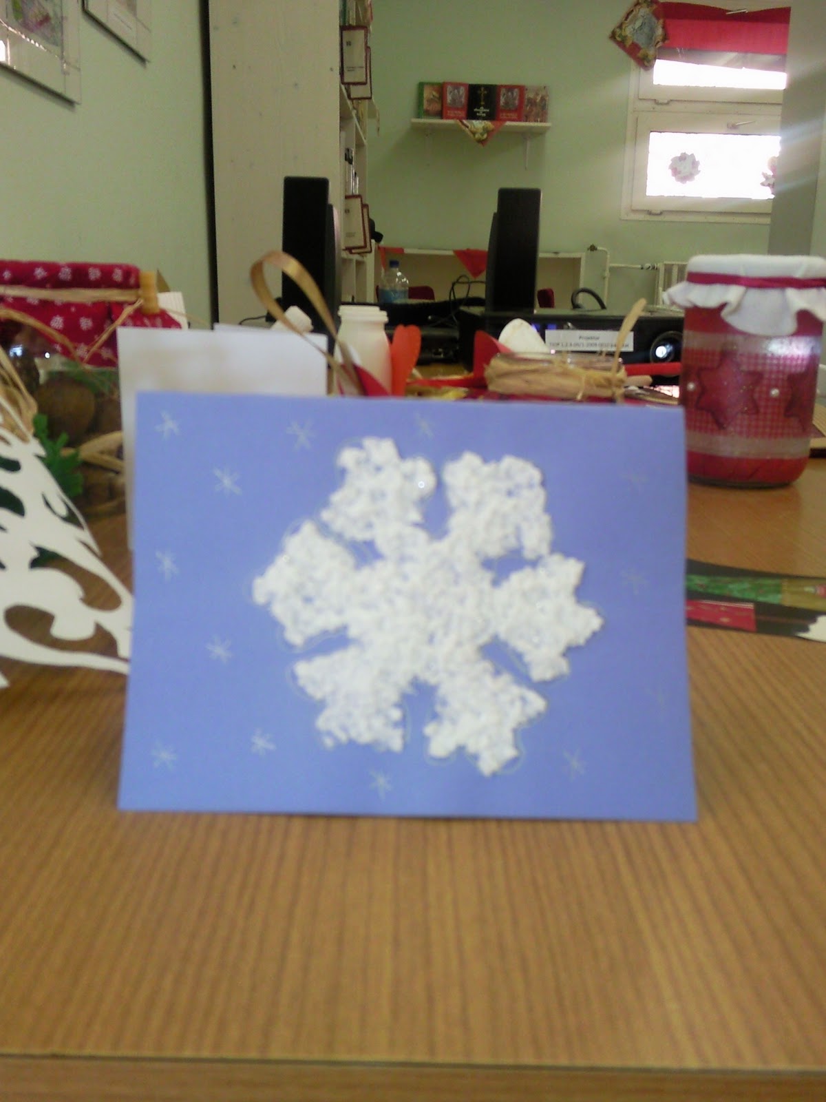 A hobby boltokban lehet kapni hópasztát, amibe érdemes csillámport tenni. A hópehely formáját rárajzoltam a kartonra és befedtem a hópasztával. Ezüst csillagokat is rajzoltam rá, majd a hópelyhet is körberajzoltam.