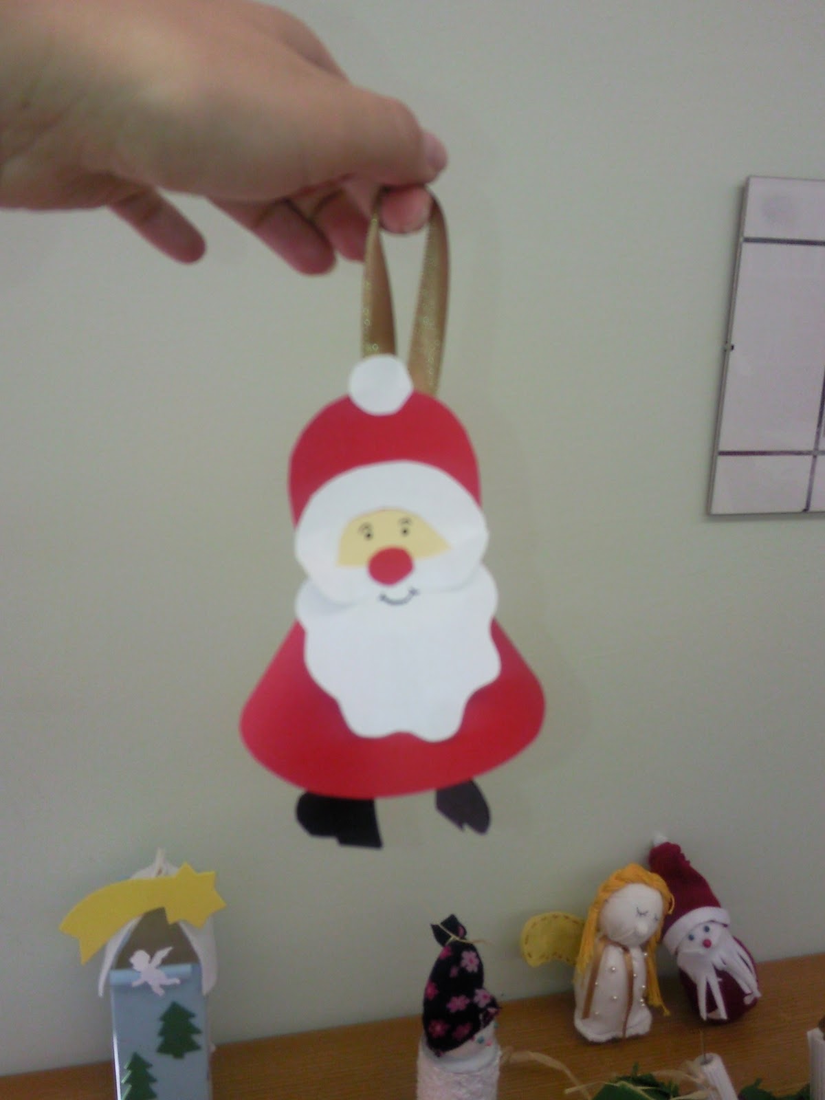 Ezt a télapót a szentistváni kolléganőktől kaptam, akik mindig nagyon ötletes dolgokkal állnak elő. A télapó kartonból készült. Készíts egy piros “tölcsért”, majd rgaszd rá a fejét. A lábát szallaggal lógatták és került rá egy akasztó is. Ők ezzel díszítették az iskola karácsonyfáját és állítólag nagyon jól nézett ki.