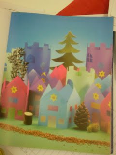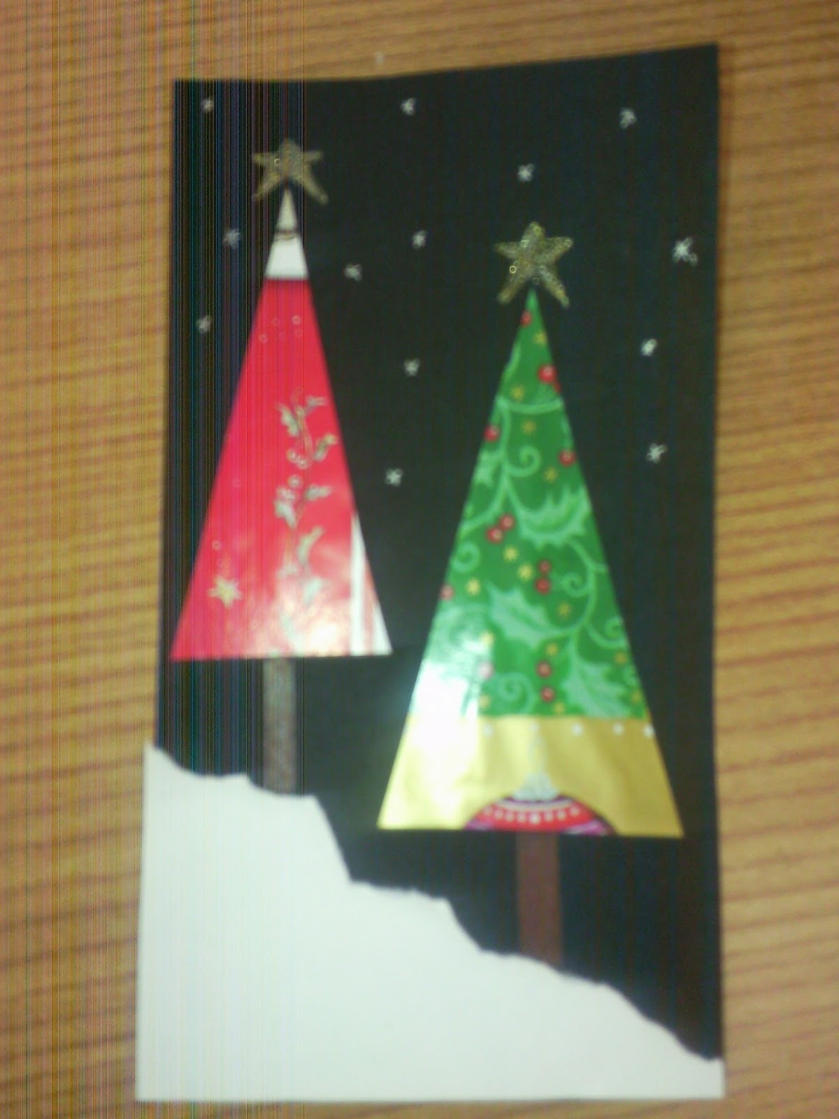 Ezt az ötletet is a szentistváni kollégáktól kaptam. Mint látható, a karácsonyfa maradék csomagolóból készült, amit egy fekete kartonra ragasztottak. A hófedte domb pedig sima rajzlap, amit eltépkedttek. A csillagokat rárajzolták.
