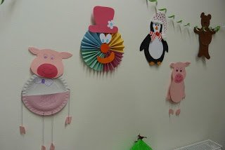 A bohócot már ismerhetitek, hiszen ezt az ötletet egy tanítónőtől kaotuk és már fenn van a blogon, de leírom, hogyan is készül: egy A/5-ös méretű színes lapot harmónikában meghajtjuk, majd a közepénél meghajlítjuk és legyezőt formálunk belőle, középen összeragasztva. Ezt még 3-4 színnel megcsináljuk, majd összeragasztjuk őket, hogy egy kör formát kapjunk. Ha ez kész, akkor jöhet a szeme, szája, orra, kalapja stb. Nagyon egyszerű. de mégis mutatós darab.